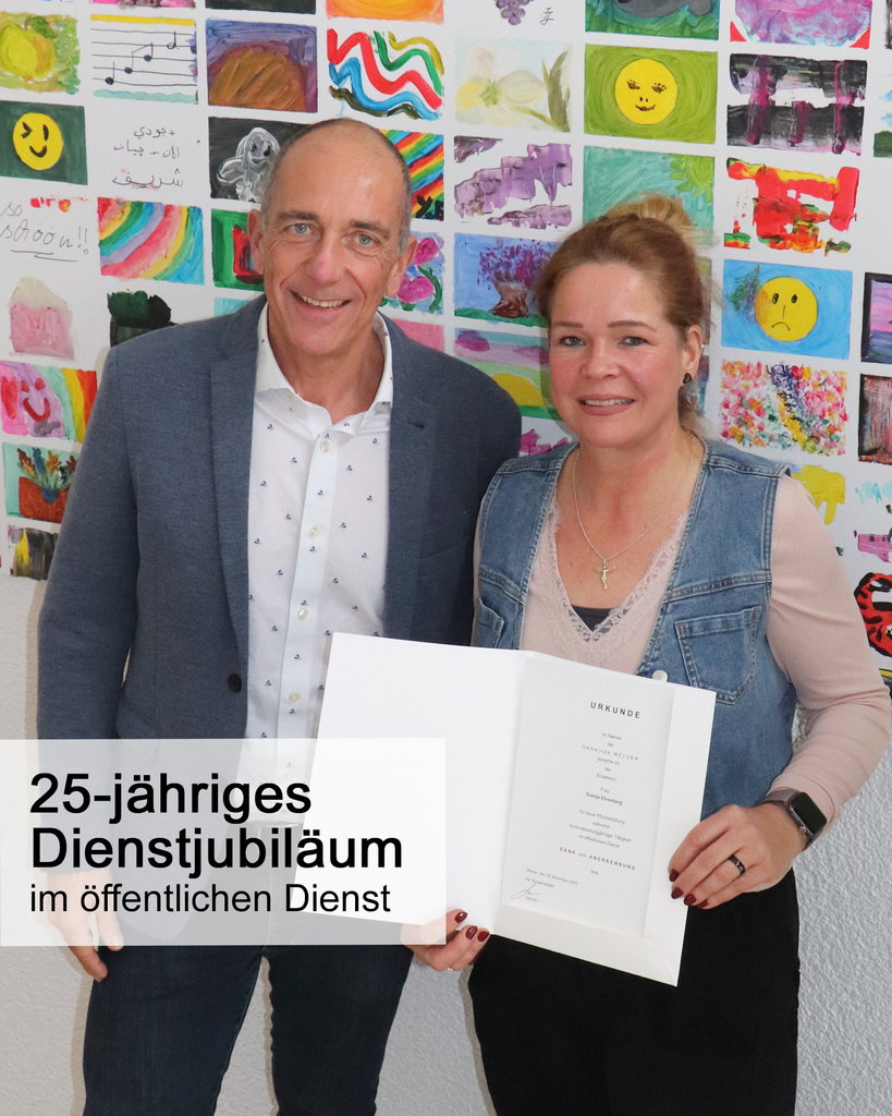 Seit dem Jahr 2000 arbeitet Svenja Ehrenberg im öffentlichen Dienst als Erzieherin. 23 Jahre davon in den Diensten der Gemeinde Welver. Während dieser Zeit war sie sowohl bei den „Salzbachstrolchen“ in Scheidingen als auch bei den „Tausendfüßlern“ in Welver tätig. Hier ist die zweifache Mutter als Integrationskraft für schwierige Aufgaben mit besonderem Förderbedarf zuständig. Bürgermeister Garzen gratulierte bei einer kleinen Feierstunde. „So ein Dienstjubiläum ist immer etwas Besonderes. Es zeigt vor allem die Verbundenheit von Frau Ehrenberg zu ihrer Arbeit!“ (lü)