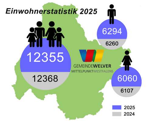 Die neue Einwohnerstatistik für das vergangene Jahr 2025 liegt nun vor. Zum Stichtag 31.12.25 gab es in Welver 12.355 Einwohnerinnen und Einwohner. Das sind exakt 13 weniger als beim letzten Stichtag Ende 2024. Entgegen dem Deutschlandtrend bei dem es mehr als eine Million mehr Frauen als Männer gibt, haben in Welver die Männer die Mehrzahl. Den 6.060 Frauen in der Gemeinde stehen 6.294 Männer gegenüber. In diesem Jahr gibt es keinen Ortsteil indem es genauso viele Männer wie Frauen gibt.