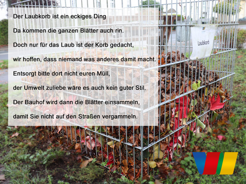 In den letzten Tagen wurden im Gemeindegebiet alle beim Bauhof befindlichen Laubkörbe aufgestellt. In die 70 Behältnisse soll das Laub der Straßenbäume eingefüllt werden. „Bitte füllen Sie keine Gartenabfälle, Grasschnitt oder gar Geäst in die Körbe ein. Es führt zu Problemen bei der Leerung und der Kompostierung“, so Bauhofleiter Hans Wilms. Gartenabfälle und Laub aus dem eigenen Garten müssen selbst (z.B. grüne Tonne) entsorgt werden. (lü)