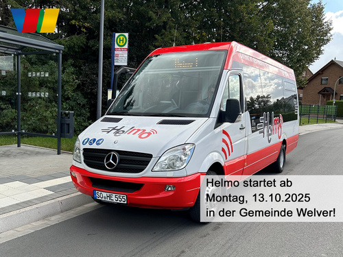 Am dem 13. Oktober nimmt Helmo den Betrieb in der Gemeinde Welver auf. Dadurch verbessert sich das Angebot deutlich. Alle Haltestellen im gesamten Gemeindegebiet werden von Helmo, einem Kleinbus, bedient: immer montags bis freitags von 8:00 Uhr bis 12:00 Uhr sowie von 14:00 Uhr bis 19:00 Uhr und samstags von 9:00 Uhr bis 15:00 Uhr. Es gibt keinen festgelegten Linienweg und keinen vorgegebenen Fahrplan. Überall, auch in den kleineren Ortschaften, ist es möglich, entweder ein- oder auszusteigen.